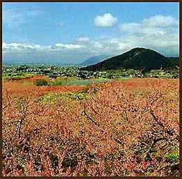 春になると、塩山桃源郷は平地から丘陵地帯にかけて、ピンクのじゅうたんを敷きつめたように、いっせいにモモの花や、スモモの花が咲ききそう。 甲府盆地西方の、南アルプス連山は頂きに残雪をつけ、盆地の春がすみのかなたに雄大な姿をみせる。 やがてモモ畑は赤い実りをむかえ、観光農園はモモ狩りの人々でにぎわう。 初夏から秋にかけてはブドウのシーズンで、デラウエアにはじまり、ネオマス・巨峰・甲州種など、多彩なブドウ狩りを楽しむことができる。 モモ狩リから秋のブドウ狩りまで、果実郷は活気にあふれる。 |